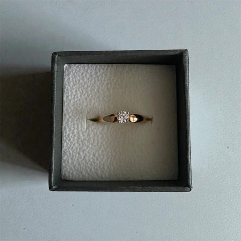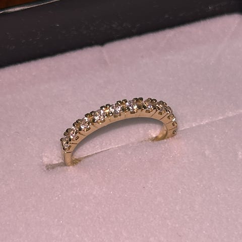Smal og delikat gullring i 10k gult gull med dinglende charm med 7 små diamanter. Spesiell ring hvis man vil ha en ring som ikke alle andre har.