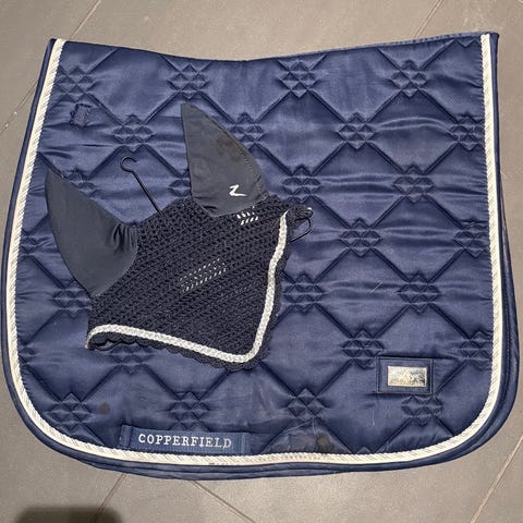 sjabrak og ørehette i størrelse. Ørehetten er heklet med tøyører og matchende kantbånd. Det er ny vasket, tiltross for at den har tydelige bruksmerker på undersiden. Ingen store synlige merker på oversiden eller på ørehetta.