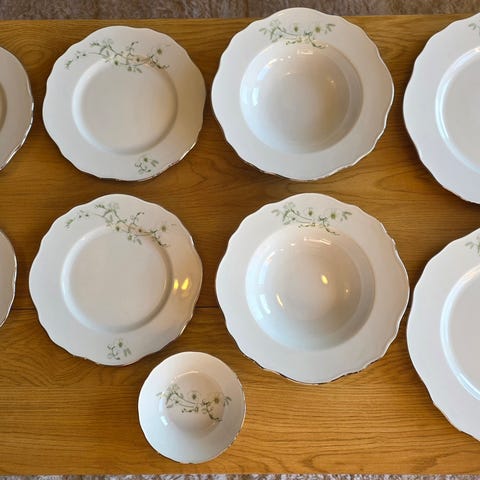Kjøpte detta på salg hos Firkløveren for nokre år sia men er aldri blitt brukt. Serviset heiter Sonja og eg selger 12 middagstallerkener og 12 asjetter for 2300 kr. Veldig fint🤩 Serviset befinner seg på Kyrkjebø i Sogn og Fjordane, kan leveres strekka Høyanger-Førde. Kvalitetsporselen som kan vaskast i oppvaskmaskin👌 Sender ikkje.