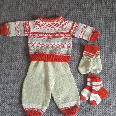 Hjemmestrikket ullsett strikket i superwash merinoull.