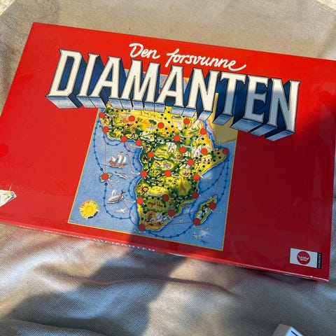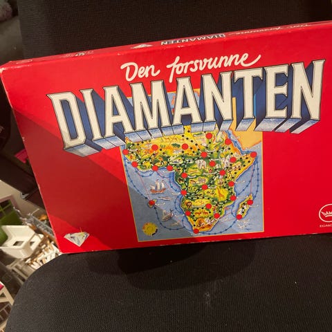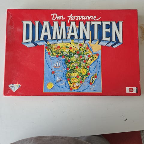 Den Forsvunne Diamanten brettspill. Klassisk familiespill der spillerne beveger seg rundt på et kart over Afrika for å finne den forsvunne diamanten. Spillet inneholder spillebrett, spillepenger, spillebrikker, markører og spilleregler. Egnet som underholdning for flere spillere rundt bordet.