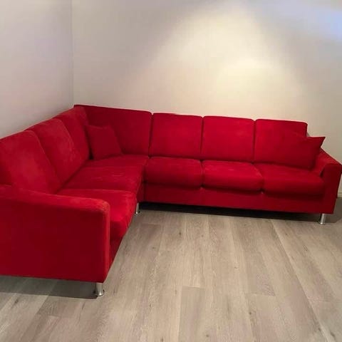Sofa i rødt tekstiltrekk. Løse rygg- og pynteputer i samme stoff. Står på ben i metall. Sofaen har god sitteplass til tre i bredden.