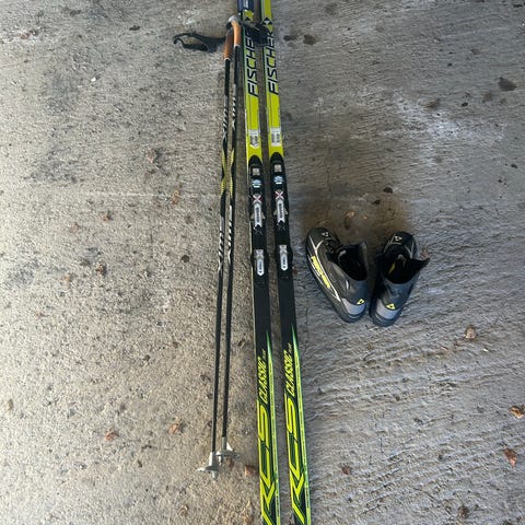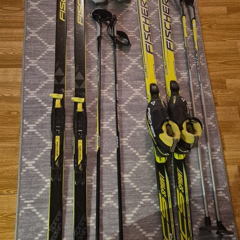 Fischer langrennski med tilhørende staver. Klassiske langrennski med bindingssystem montert. Pent brukt.