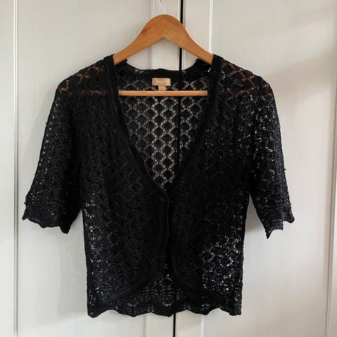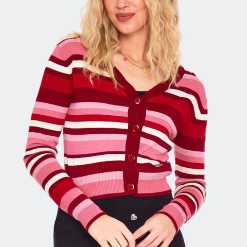 Kort, retro cardigan med hjertemønster, lange ermer og V-hals.