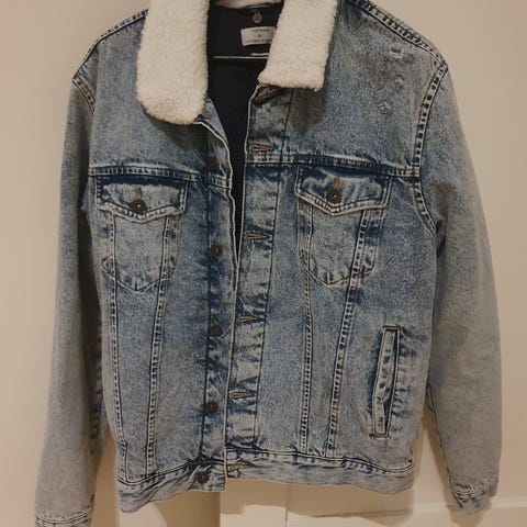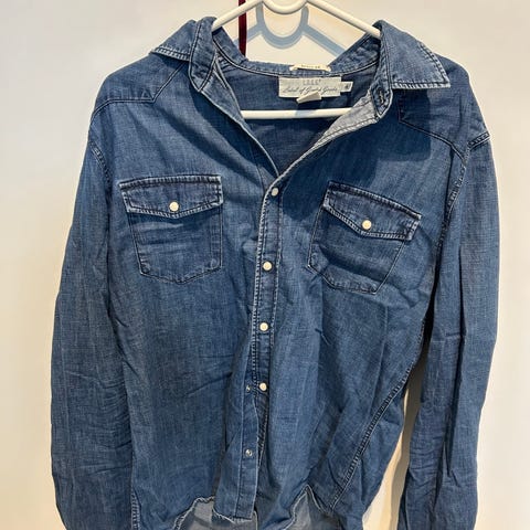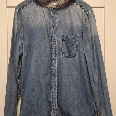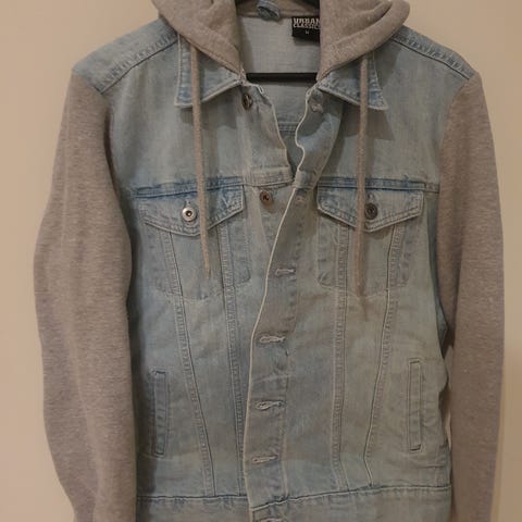 Herrejakke i denim med hette i sweatshirt-materiale. Jakken er blå og i størrelse M. Den har knappelukking foran og to brystlommer med klaff og knapp. Hette med snøring i kontrastfarge. Egnet som uformell ytterjakke til hverdagsbruk.