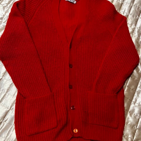 Flott og klassisk rød strikkejakke.