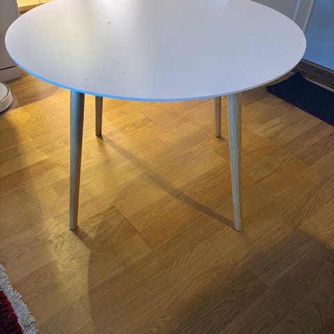 Liten, hvitt og fint rundt bord, som kan brukes som sidebord ,kjøkkenbord eller spisebord.