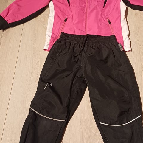 Jakken er i rosa nyanser med glidelås foran. Buksen er svart med Dæhlie-logo på låret. Begge deler er laget for junior og egner seg til ski og annen utendørs aktivitet.