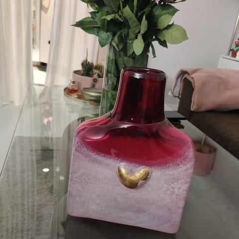 Hadeland Glassverk vase i glass. Vasen har en rektangulær, avrundet form med tykk glasskant i mørk lilla øverst og lysere, melert glass nederst. På forsiden er det et lite hjerteformet dekorfelt i gullfarge. Passer til dekorasjon eller som blomster- og pyntevase i ulike rom i hjemmet.