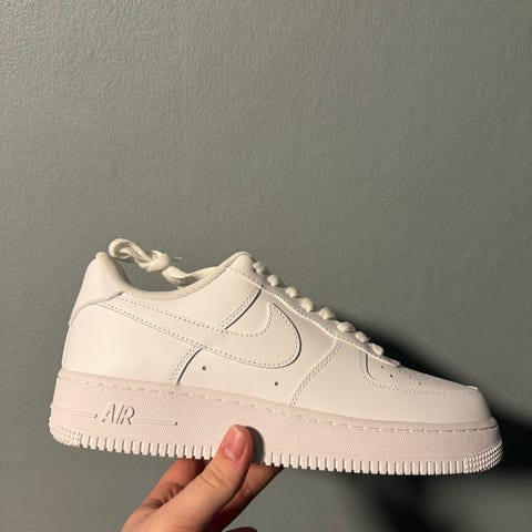 Nike Air Force 1 joggesko i størrelse 43. Modellen har lav profil med snøring og klassisk Nike Air-logo på hælen. Skoene er i grønn farge med overdel i tekstil og semsket preg, samt lys mellomsåle og yttersåle i gummi. Egnet som hverdagssko og fritidssko.