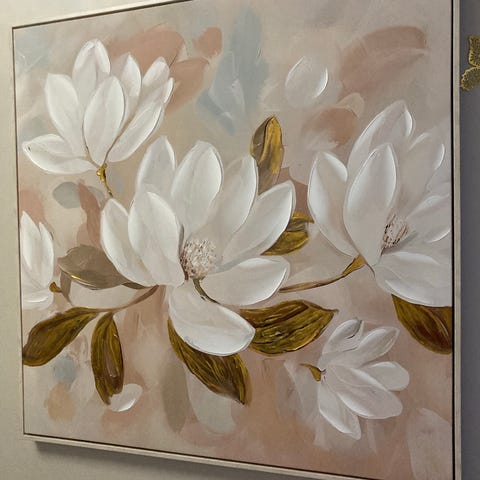 Blomsterbilde maleri i pastellfarger med motiv av store pioner i lyse toner. Bildet viser blant annet hvite og lyse rosa blomster med grønne blader mot en lys bakgrunn. Maleriet passer som veggdekor i stue, soverom eller andre oppholdsrom der man ønsker et rolig og lyst uttrykk.