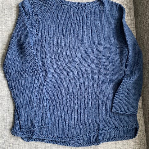 Blå ullgenser i størrelse M/L. Den er hjemmestrikket, og brukt svært lite.
