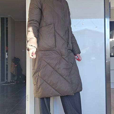 Veldig mørk grønn lang vinterjakke med knytebelte. Glidelås og knapper. Stor hette og veldig varm. Kjøpt på Vero Moda i Januar. Brukt en gang.Ny pris ca 900 kr.