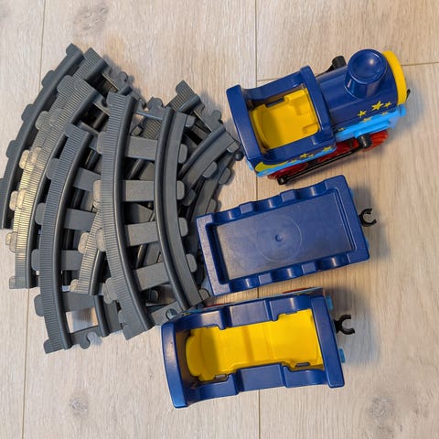 Lego Duplo togbane med rundt skinneoppsett og tog med to gule vogner. Toget kjører dessverre ikke lengre, derav prisen.