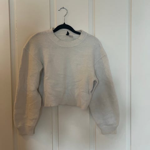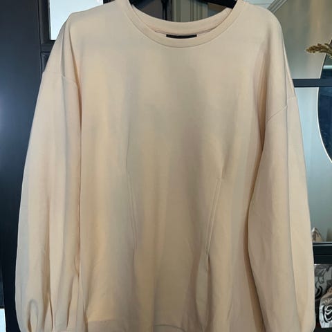 Off white crewneck genser i college stoff fra H&M studio 2018. Genseren har folder ved skuldre og ned mot brystet, og ved ermene, litt voluminøs og boxy fit.