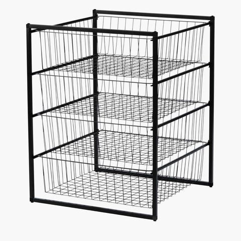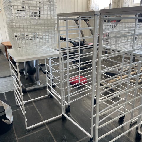 Norscan Roller kurvstativ i sølvgrå farge. Bredde 55 cm, høyde 205 cm, dybde 50 cm. Kurvstativene kan monteres oppå hverandre for å få et høyere kurvstativ. Komplett sett, med sidepanel, bindestag, 3 store og 3 små kurver.