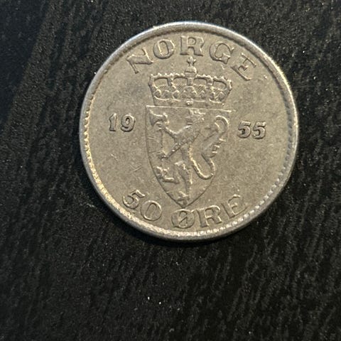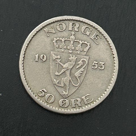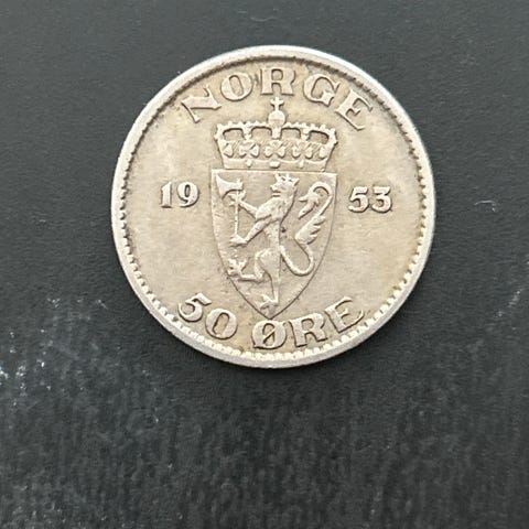 Norge 50 øre mynt fra 1956 med motiv av riksvåpenet på advers og monogrammet til kong Haakon VII på revers. Mynten er rund og preget i metall med påskriften «Norge 50 øre 1956» på den ene siden og «Norges konge Haakon VII» rundt monogrammet på den andre siden. Egnet for samlere av norske mynter og numismatikk.