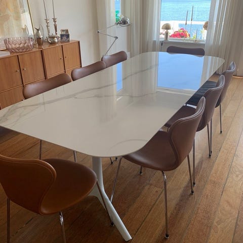 Italienske stoler i brunt skinn kjøpt på Helgø møbler. De er justerbare i ryggen og veldig gode å sitte i. Selger 4 stykker. Pris per stykk.