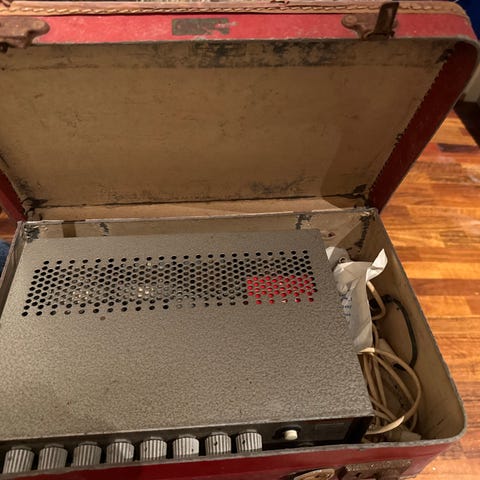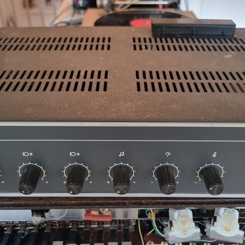 Philips 1143/00 musikk PA forsterker mikser. Det er strøm på enheten og den blir varm. Har ikke testet den da jeg ikke vet hvordan høyttaler(e) skal tilkobles. To av plastknottene på skyvejusteringene mangler. Enheten er tung !