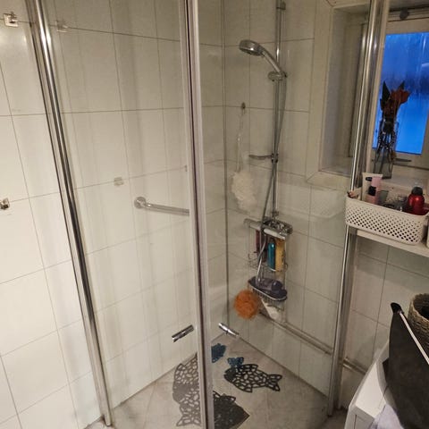 Dusjhjørne med glassdører og aluminiumsprofiler. Består av to innadslående glassdører montert i hjørne