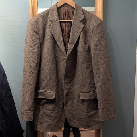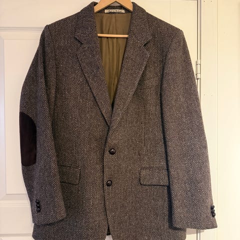 Pent brukt vintage blazer i ull, str 52/54. Meget pent rutete mønster med brun som base, og innslag av mørk brun samt mørk burgunder. Stoffet er av typen Travel Harris, et letter ullstoff enn den grovere Harris Tweed. Tre knapper i klassisk stil som sammen med fraværet av splitt gir en slank silhuett. Selges da den har blitt for stor.