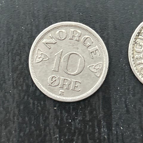 Norge 10 øre mynt fra 1954. Forsiden viser kongemonogram under krone med årstall delt på hver side. Baksiden har påskriften «Norge» og valøren «10 øre» med dekorative elementer. Egner seg som samleobjekt for norske mynter og numismatikk.