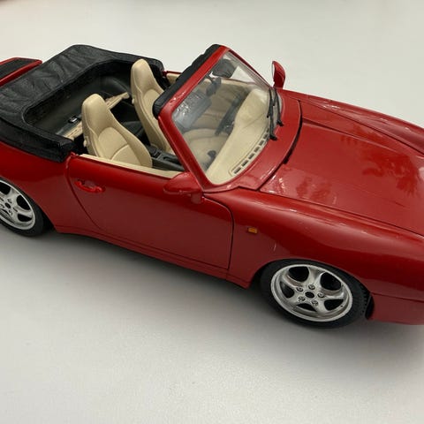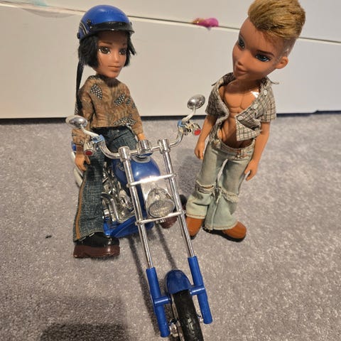Bratz bil. Dører og koffert lokk kan åpnes. Det sitter to batterier under bagasjerommet. Det skal vist nok være til radio og lys. Men jeg vet ikke hvordan man får det i gang. Bilen er i bra stand ellers. Detaljert interiør. Den har til og med sikkerhetsbelter. Lengde 45 cm. Bredde 18 cm.