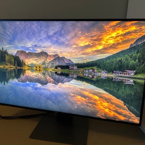 God skjerm med USB hub, DP og HDMI. Skjermen kan tiltes, høydejusteres og roteres.