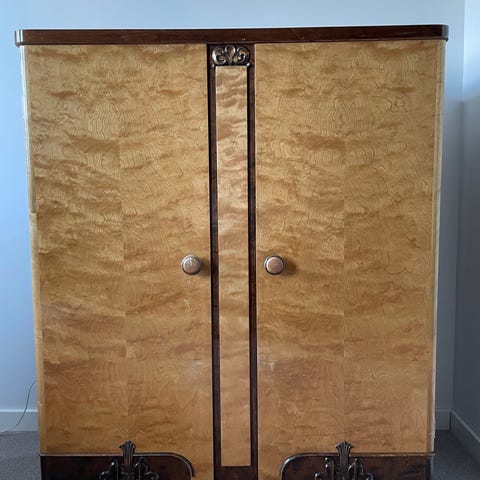 Vakkert, gammelt heltre skap med flotte utskjæringer og originale messingbeslag. Et skikkelig kvalitetsmøbel i massivt tre – solid, tungt og bygget for å vare.