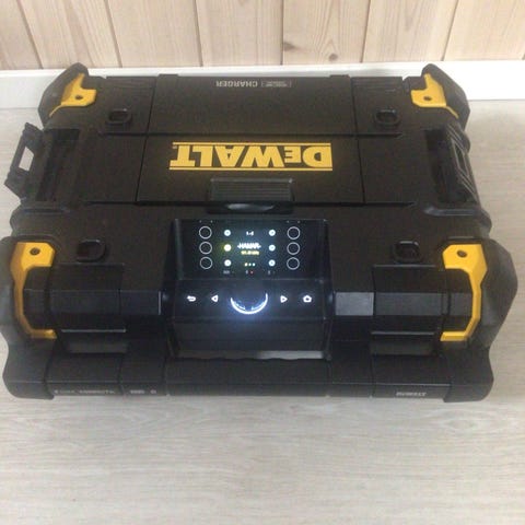DeWalt TSTAK DAB+ byggradio med lader i svart design. Radioen er integrert i en TSTAK-modul som kan stables og kobles sammen med andre TSTAK-kofferter. Enheten har DAB+ og FM-radio, kontrollpanel med display og betjeningsknapper på fronten. Det er innebygd lader for DeWalt-batterier, samt bærehåndtak for enkel transport. Egner seg for bruk på byggeplass og i verkstedmiljøer, og kan kombineres med øvrig TSTAK-system for organisering og transport.