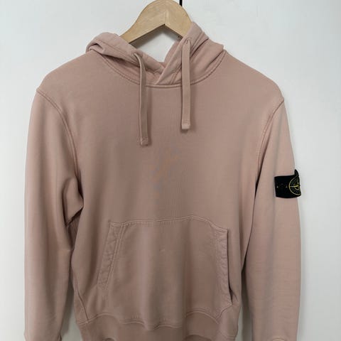 Stone Island hettegenser i herremodell, størrelse L. Genseren er rosa og laget i bomull. Klassisk hette med snøring og ribbestrikkede kanter nederst og ved ermene. Avtagbar Stone Island-logo på ermet. Passer til hverdagsbruk og kan kombineres med både jeans og joggebukse. Jeg kjøpte den for 400 euro i den sentrale Stone Island-butikken (Roma Italia) 2025 kolleksjon