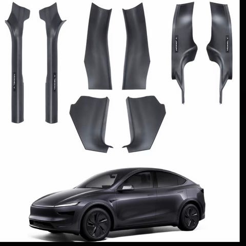 Tesla Model Y terskelbeskytter for innvendige dørterskler foran og bak. Settet består av flere formtilpassede deler som dekker terskelområdet ved for- og bakdører.