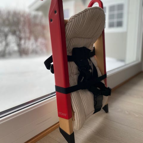 Stokke barnestol i grå tekstil med integrert sele. Stolen har polstret sete og rygg med myk overflate, samt støtte på sidene for økt komfort for barnet. Understellet er i lyst materiale med bøylekonstruksjon som gir lett gyngefunksjon. Passer til små barn som trenger støtte til å sitte og ligge halvveis tilbakelent. Egnet til bruk innendørs på gulv.