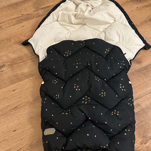 Voksi vognpose i svart ytterstoff med lyst fôr med mønster. Vognposen har åpninger for seler slik at den kan brukes i barnevogn med 3- eller 5-punktssele. Ytterstoffet er vattert for ekstra isolasjon, og innsiden er myk for økt komfort. Produktet er merket med OEKO-TEX Standard 100. Egnet til bruk i barnevogn for baby og småbarn.