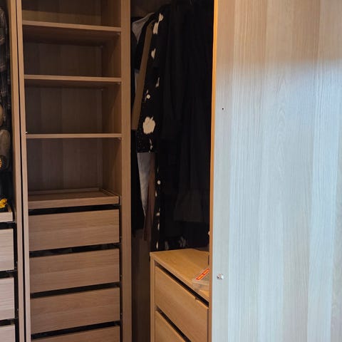 Pax garderobeskap fra IKEA, ferdig demontert og dermed enkelt å hente. Selges på grunn av manglende plass. Veldig praktisk og pent skap med plass til mye. Har vært i bruk inntil januar. Inneholder en hvit nettingkurv, 4 hylleplater og 3 skuffer. Alt unntatt kurven er i hvitbeiset eikemønster. Selges rimelig pga noen skader under demontering, ellers i god og pen stand: Noen riper øverst og nederst på den venstre veggen, se bilde. Det synes ikke om skapet står inntil veggen. En liten skade under i hjørnet på de tre skuffene, se bilde. Synes ikke siden det er under. Liten skade også på en list, se bilde. Ny pris totalt for alle deler: 5655,-. Her er mer informasjon fra IKEA ( lenken er til selve rammen til skapet - og så kommer alle de andre delene som et tillegg i prisen): https://www.ikea.com/no/no/p/pax-garderobeskapstamme-hvitbeiset-eikemonster-30183989/