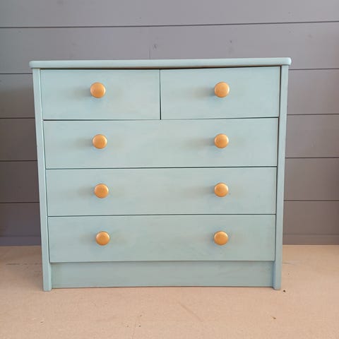 Lyse blå kommode, oppgradert med fine håndtak, fabrikmalt