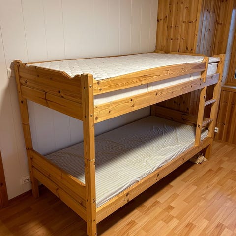 IKEA køyeseng i ubehandlet furu med liggemål ca. 90x200 cm. Sengen har to sengeplasser over hverandre, med integrert stige på kortsiden og sengehest øverst for økt sikkerhet. Ribbe-bunn i tre gir støtte til madrassene. Passer til standard enkelmadrasser 90x200 cm. Egnet for barnerom eller rom der man ønsker to soveplasser på liten gulvflate.