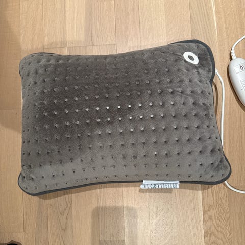 Menuett elektrisk fotvarmer i grå tekstil med hvit fleecefôr. Produktet kobles til strøm og har betjeningsenhet på ledningen for regulering av varme. Fotvarmeren er egnet for innendørs bruk og gir jevn varme rundt føtter og ankler. Yttermaterialet er mykt vattert stoff, mens innsiden er kledd med myk fleece for økt komfort. Passer til én person om gangen og kan brukes sittende i stol eller sofa.