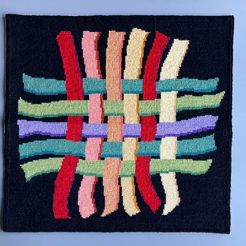 Håndlaget brodert bilde med fargerikt motiv i korssting.
