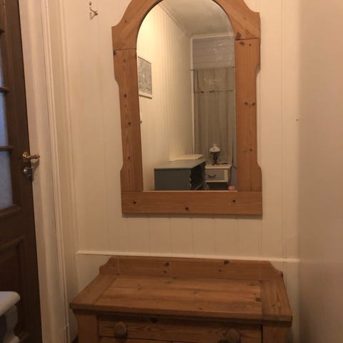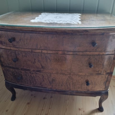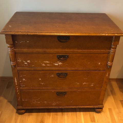 Eldre kommode i heltre furu med tre romslige skuffer. Overflaten har synlig trestruktur og naturlig, lys furufarge. Skuffene har runde metallbeslag og sentralt plassert nøkkelhull i øverste skuff. Topplaten består av brede furubord, og kommoden har profilert sokkel og dreide sideben. Baksiden er i tre med enkle avstivninger. Egner seg som oppbevaringsmøbel på soverom, gang eller stue, med god plass til klær, tekstiler eller annet utstyr.