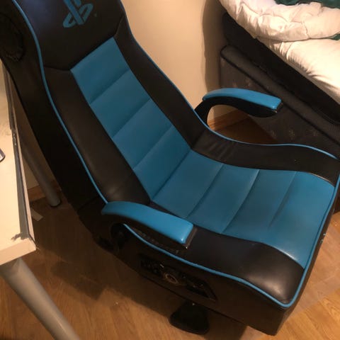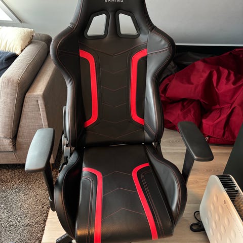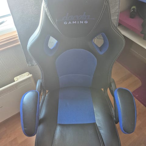 DXRacer gamingstol i svart og blå farge. Stolen har høy rygg med integrert hodestøtte og avtagbare puter for nakke og korsrygg. Sete og rygg er trukket i kunstskinn med polstret sitteflate og ryggparti. Armlenene er justerbare i høyde. Stolen har hjulunderstell og regulerbar høyde. På bildene vises slitasje i trekk på sete og rygg samt noe avskalling i overflaten på enkelte områder.