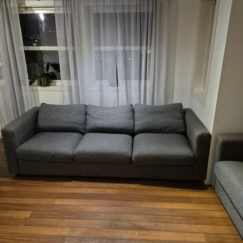 Den lengste sofaen er noe nedsunket i putene, men den er fortsatt helt fin og behagelig i bruk.