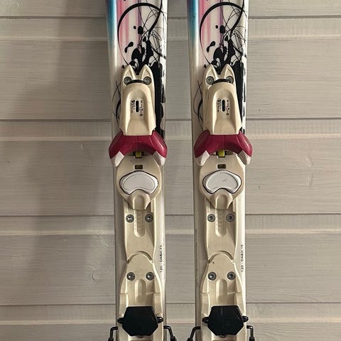Dynastar alpinski med staver i hvit og flerfarget design. Skiene har integrerte bindinger og er egnet til alpint bruk. Medfølgende staver har håndtak med reimer. Passer til bruk i alpinbakke for vanlig skikjøring.