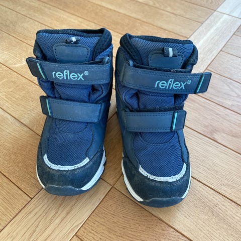 Reflex vintersko for barn, unisexmodell i størrelse 30. Skoene er i hovedsak blå med mørke og lyse kontrastdetaljer. Overdelen er i tekstil og syntetisk materiale, med borrelåslukking for enkel av- og påkledning. Polstret skaft og innside gir god komfort, og yttersålen er i gummi for bedre grep. Egnet som hverdagssko i kaldere vær for både gutter og jenter.