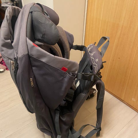 Phil&Teds barnemeis i grå og Oransj farge. Meisen har polstret bæresystem med justerbare skulderstropper og hoftebelte for bedre vektfordeling. Det er integrert støttebøyle slik at barnemeisen kan stå stødig på gulvet ved inn- og utlasting. Egnet til å bære barn på tur og i hverdagen, med plass til barnet i et sete med seler samt noen mindre oppbevaringslommer til nødvendig utstyr.