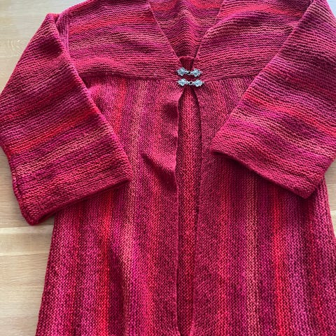 Kjempefin hjemmestrikket lang jakke i størrelse S. Den er god og varm og flatterende.