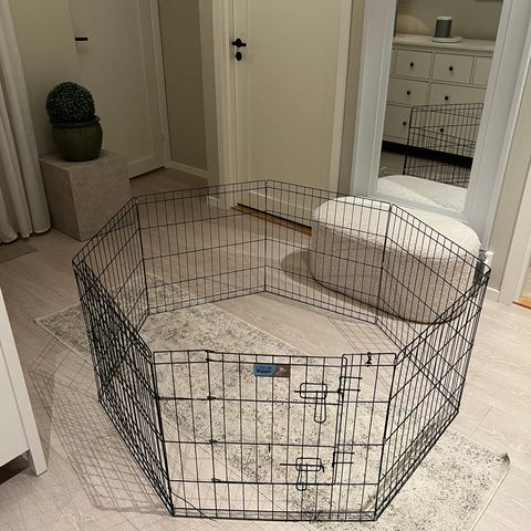 Fleksibel og enkel å montere opp og ned. 8 moduler med 78 cm bredde. En av modulene har en port med 20 cm høy terskel. Solid som bare det.
