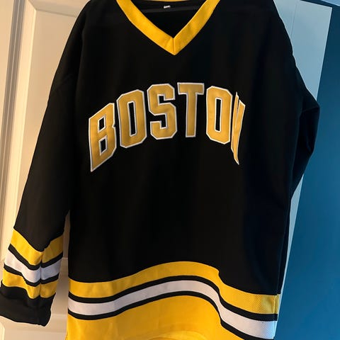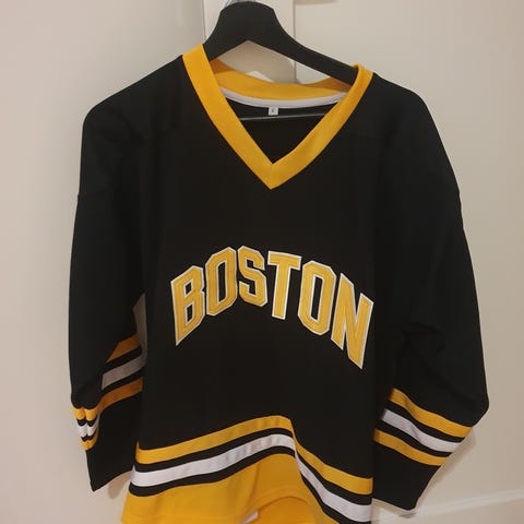 Reebok Boston Bruins hockeytrøye i størrelse M for menn. Trøyen er svart med gule og hvite detaljer, og har Boston Bruins-logo på brystet. Snøring i halsåpningen og lange ermer. Egnet som supportereffekter eller til bruk ved ishockey og annen fritidsaktivitet.