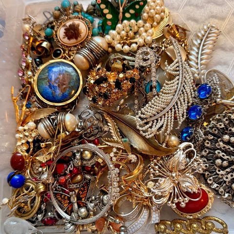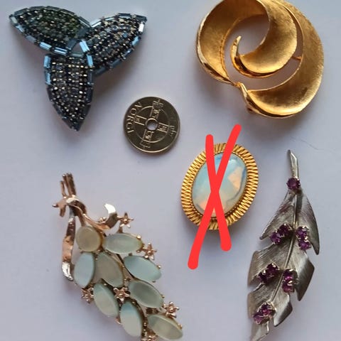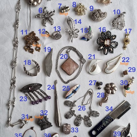 Det er nåler, kots-anheng, og to til å feste skjerfet -de to nede ved korset. Er to nåler som nok er sølv og emaøje-den største har noen striper som kanskje ikke skal være der. Spør dersom noe er av interesse.