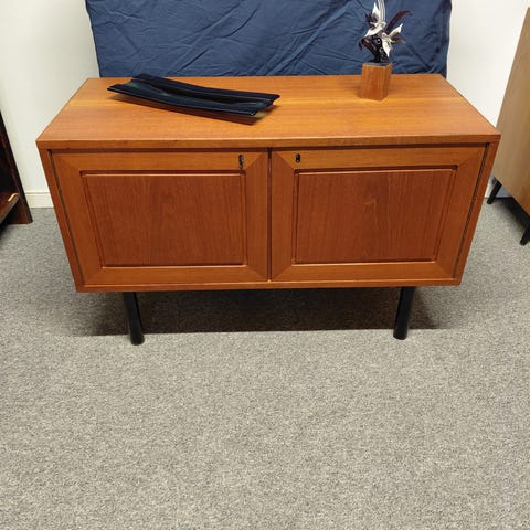 Nydelig teak kommode selges. Den har blitt pussa ned og fått nytt lag med teak- olje. Sidene er malt med mørkere brun maling.